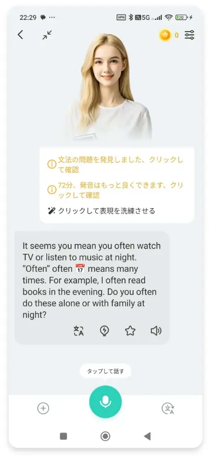 - タップして話す簡単操作で、気軽にスピーキング練習が可能