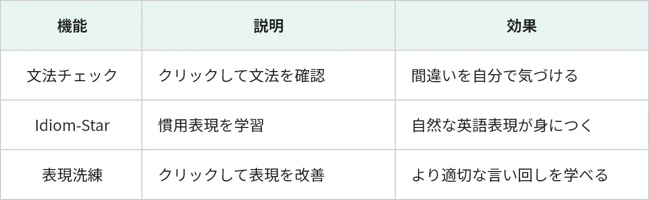 - 自分の発言内容を即座に日本語で確認できるため、表現の正確さが向上